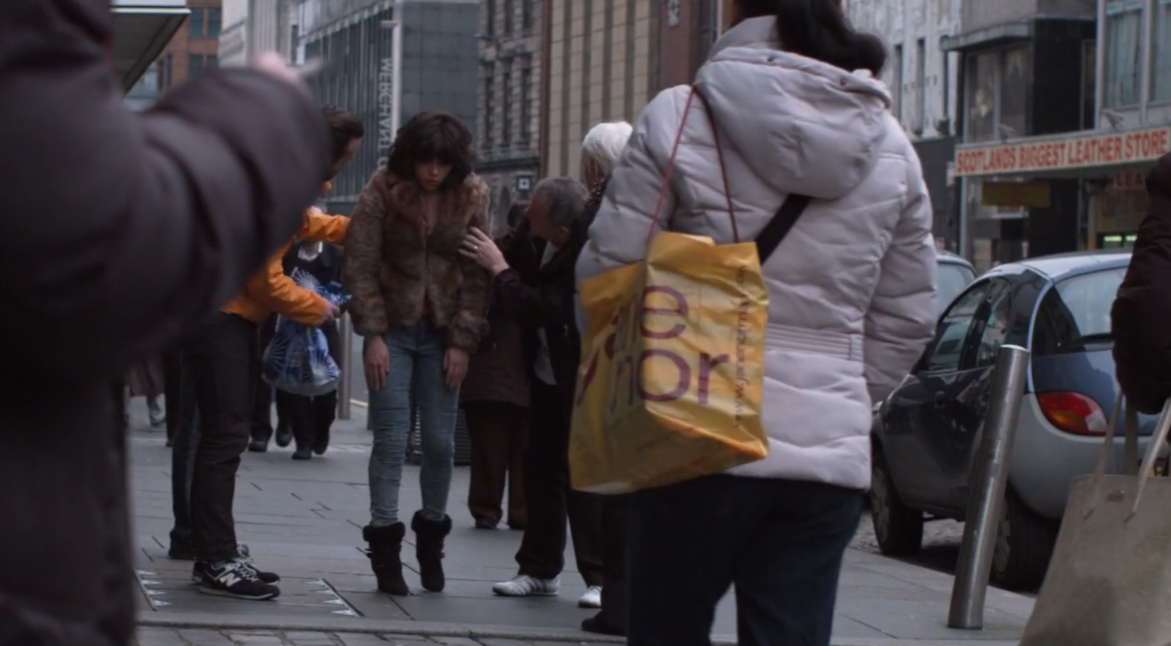 Smoothness has become the central motif of digital capitalism and if this is taken to its extreme it becomes devoid of any human qualities. These qualities are considered a hindrance, they interrupt, slow down, interfere with the smooth functioning of capital and its dream of unmediated exchange. The philosopher Byung-Chul Han pointedly articulates the shift to the smooth and the digital as seeking to dispense with any notion of the other or alien that disrupts its mirrored surface[12]. Yet , as we see in the film, it is precisely a trip, a catching of her foot, that begins an unravelling of this mission. Now passers-by hands reach out to help her to stand and they brush against the fur of her coat, just as she felt the textures of the clothing that would disguise her. This leads to an encounter with a human subject, a male, who very definitely cannot pass, who hides and walks only in shadows at night. It is her invitation for him to touch her face that triggers a switch in her subjectivity. The anthropologist Anna Tsing titles her book Friction and describes certain sites of interconnection inherent to globalisation as places that can generate culture, where this is defined as awkward points of friction[13]. Glazer designs this scene precisely as one of awkward exchange.