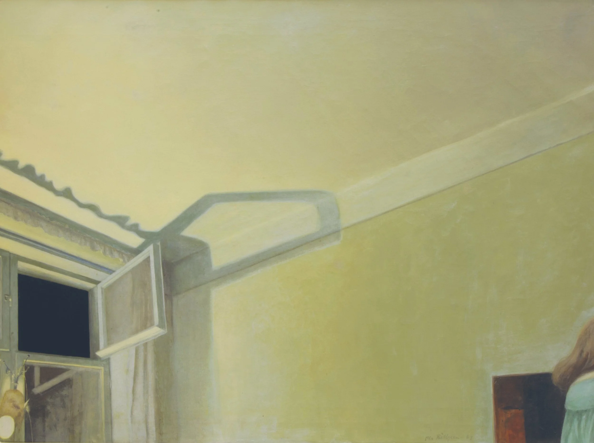 Ytan i Persienn kunde tas ett steg till, som i Interiör (1966), i vilken målningens huvuddel upptas av en vit vägg, vid vars högra sida ett vardagligt rum skymtar fram, samtidigt som vi i den vänstra delen kan ana en affisch med motiv av Toulouse-Lautrec. Feuk ser här ett närmande till vardagen samtidigt som den vita ytan rycker oss bort från den, ur vilket han utläser något likt ett utopiskt motiv, tanken på det egentliga livet som ”ännu väntar på att förverkligas” (127). Om detta liv någonsin förverkligas i de senare faserna av Billgrens måleri kan förbli en öppen fråga – Konst, noterar Adorno vid samma tid, ”är det löfte om lycka som blir brutet”.[4]